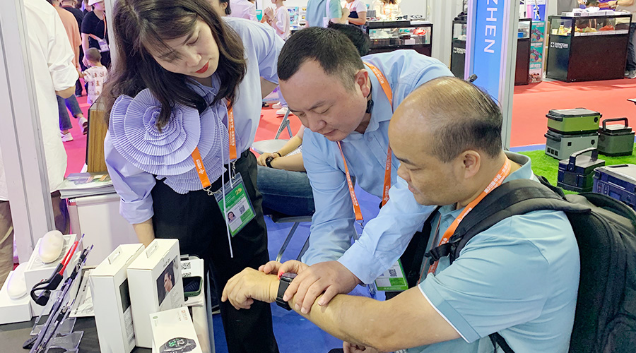 奋达科技全自研算法检测血压的智能手表Gamma Watch 在展会期间也大放异彩,不少东南亚国家商会的代表都对Gamma Watch内置的气泵血压检测技术表示出相当大的兴趣,现场体验后对于其测量的准确度、佩戴的舒适度表示认可。